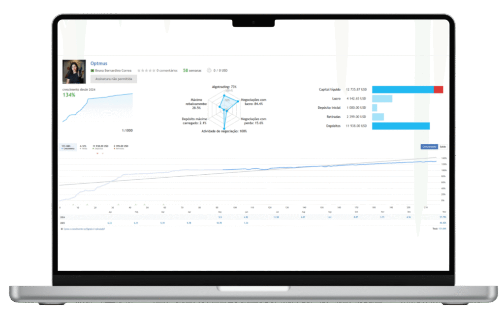 Diferente de promessas vazias, o Optmus foi validado em operação real: são mais de 12 meses consecutivos de lucro consistente e mais de 80% de assertividade comprovada em conta auditada. A IA não depende de feeling ou achismos — ela opera com base em dados sólidos e estratégias validadas, eliminando o erro humano.